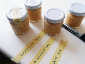 Besonders schön finde ich die Farbe, ein richtig helles Gelb mit Senfkörnern drin. Es wurden erstmal die ganzen Vorräte der Einmachgläser aufgebraucht, was sich in einem ziemlichen Sammelsurium bemerkbar macht. Für die größeren Gläser muss ich mir noch eine Deko überlegen, die ganz kleinen "Probiergläser" haben einfach eine Masking Tape Beschriftung bekommen.